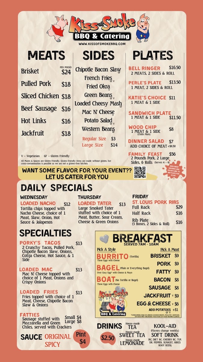 Welcome to Kiss of Smoke BBQ, nestled at 663 S Plumer Ave in Tucson, AZ, where the essence of authentic barbecue awaits! Their menu boasts a delectable mix of smoked meats and hearty sides that promise to tantalize your taste buds.